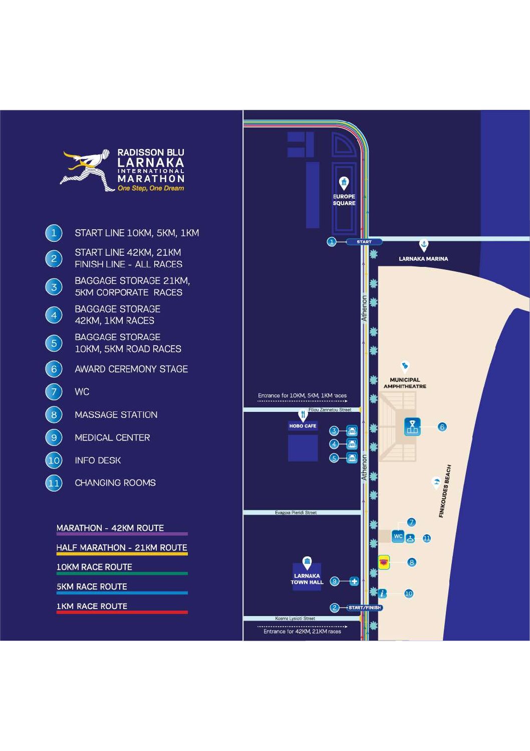 The most popular races of the event are the 5KM Individual and Corporate races and the start line is located next to the Europe square, in Foinikoudes. From the start line the runners head east and at the end of Foinikoudes they turn right towards Makariou avenue. The runners continue their race until they reach the 1st km, where the turning point of the race is located. The runners will then head west towards the city centre of Larnaka, through Makariou Avenue and across Zinonos Kitieos, passing from the picturesque city center and the historic church of Saint Lazaros.